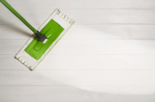 - 数枚のキッチンペーパーをモップに挟み、カビ取り剤をスプレーする。キッチンペーパーがない場合は不要なタオルや雑巾を使うといい。