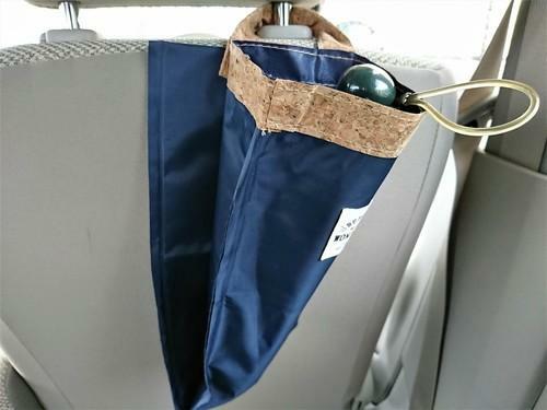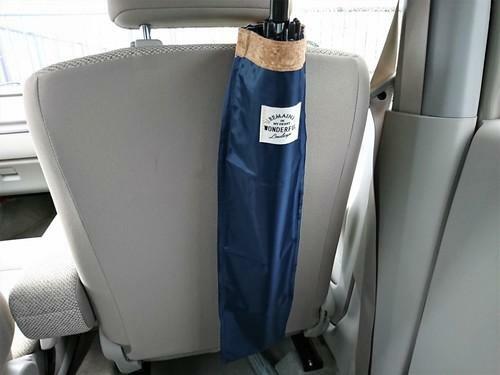 乗車する人がどんな傘を使うかわからない状況では、長傘にも折りたたみ傘にも対応できる収納袋はとても便利である。スナップつきのベルトでシートに引っかけられるので、運転席後ろに1つ、助手席後ろに1つ引っかければ、全部で4人分の傘を収納することができる。