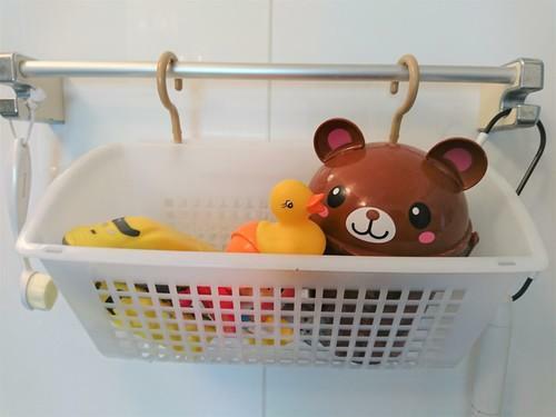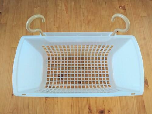 風呂場のタオルハンガーに引っかけて使ってみよう。ダイソーのスッキリ収納フックは、底面も穴があいているので水がカゴの中にたまることがなく、風呂場の収納にもぴったりのカゴなのだ。シャンプーなどのボトルを入れたり、スポンジや洗剤などの掃除道具を収納したり、子どもが遊ぶおもちゃ入れにしてもよい。風呂場がスッキリと片付くだろう。