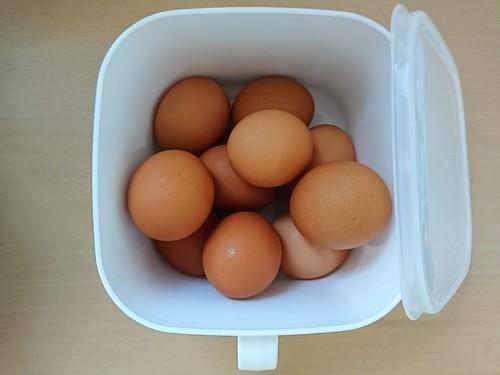 ドアポケットに卵の収納場所が設けられている場合が多いが、温度変化や衝撃が大きいドアポケットは卵の収納には向いていない。セリアの味噌ストッカーなら、1パック(10個)の卵を入れられるので、冷蔵室での卵収納に便利だ。