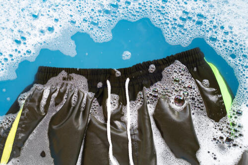 洗濯桶に×印が描かれたマークは水洗いできない衣類なので手洗いも洗濯機も使用不可だが、そもそも水着やラッシュガードは水にぬれる前提で作られている。そのため、よっぽどのことがない限り、どちらかの方法で洗濯することができるはずだ。洗濯方法を確認した後は、表示通りの方法で洗濯するが、使用する洗剤は洗濯用中性洗剤のみであり、柔軟剤や漂白剤は使用しない。ダメージに弱い水着やラッシュガードへの負担を少しでも減らせるよう洗濯ネットを利用し、洗濯のコースも「ドライ」などデリケートなものに対応しているコースで洗うとよい。
