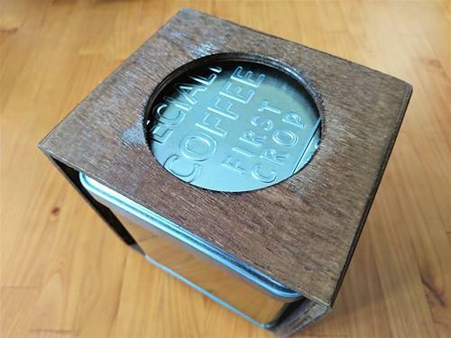 コーヒーを淹れるときにカップを置く部分は、使わないときは空っぽになるが、この部分に同じくセリアで販売しているコーヒー缶がピッタリ! シンデレラフィットするのだ。コーヒー缶にコーヒー豆やペーパーフィルターなどのコーヒーグッズを入れて、まとめて収納しておくと使うときにも便利だ。
