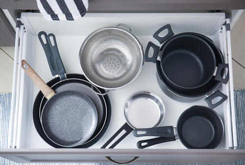 間仕切り収納は、計量スプーン・菜箸・ハサミ・おたまやフライ返しなど用途別にケースに収納するのがおすすめだ。使用頻度の高いキッチンツールだからこそ、取り出しやすい引き出し収納を活用すれば、必要なものを探すストレスから解放されるだろう。また、ケースにキッチンツールを収納する際は、1ケースにつき1~2個程度に収めると何が入っているのかが一目でわかり、スッキリと収納することができる。