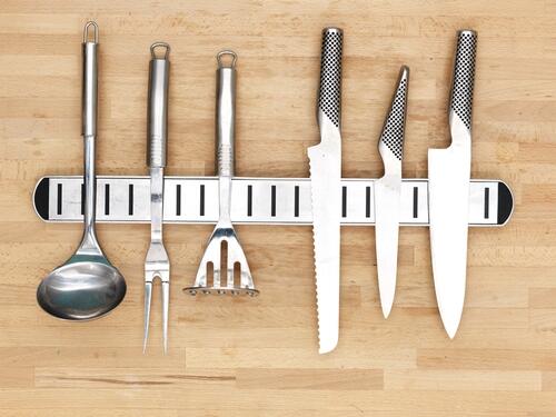 壁にとりつけたマグネットに包丁を貼り付けて収納する商品もある。「マグネットナイフラック」というこの収納は、簡単に包丁を取り出すことができるうえ、収納をオシャレに見せることもできる。また、扉の内側に設ければ省スペースにもなる。