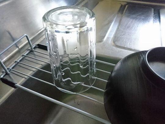 ダイソーのシンクスライド棚は、2cmほどの間隔でワイヤーが並んでいるものなので、上に濡れたものをのせると下のシンクに水を落とすことができる。洗った食器の水切りをするのに適しているのだ。持ち手の部分がストッパーになって、外側に落ちてしまうこともなくて安心だ。食器以外にも、洗った食材の水切りやふきんを干すのにも便利に使えるだろう。