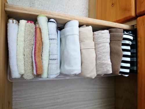靴下や下着、タンクトップ、子ども服などは小さくて、タンスの引出し内でも上手に収納するのが難しいアイテムだ。そんな小さな衣類は、ダイソーの引出し整理バスケットを使って収納しよう。仕切り板がついているので、カゴの中を区切り、衣類の種類を分けて収納することもできる。引出しへの出し入れもかんたんなので、洗濯物を片付けるときや身に着けるものを選ぶ際に、カゴごと取り出してもよいだろう。