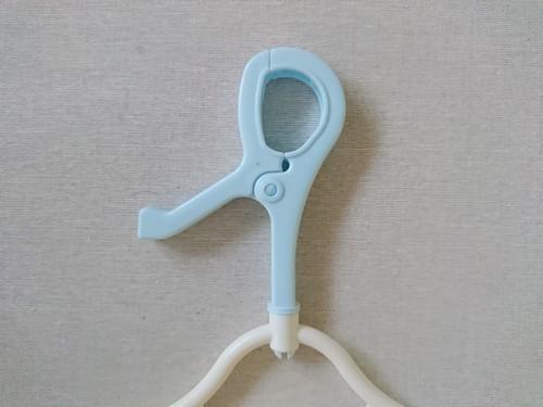 上部のフックは物干しざおをはさむタイプなので、しっかりかけることができる。また、フック部分は360度回転させられるので、どんな向きにも対応できて便利だ。カラーは、パステル調のブルーとピンクの2種類となっている。