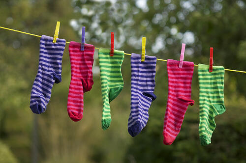 靴下の干し方も、表示を見て判断する必要がある。吊り干しの場合、洗濯バサミで挟む干し方が一般的だ。ポイントとしては、靴下のつま先を下に、履き口を上にして干してほしい。洗濯バサミはゴム部分を挟むようにすると、靴下へのダメージが少ないのだ。