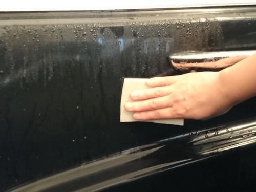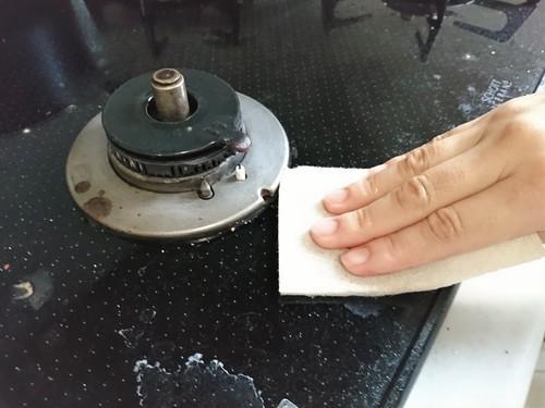重曹が加工されているので、水やぬるま湯を含ませることにより、重曹が溶けだして油汚れを浮かせる。油汚れは酸性の汚れなので、アルカリ性の性質を持つ重曹が中和させて水に溶けやすくし、浮かせてくれるというわけだ。汚れをしっかり浮き出させ、ラクにふき取るために、水を含ませた状態のセリアの重曹&ゴムの力を汚れ部分に乗せてしばらくおくのがおすすめの方法だ。