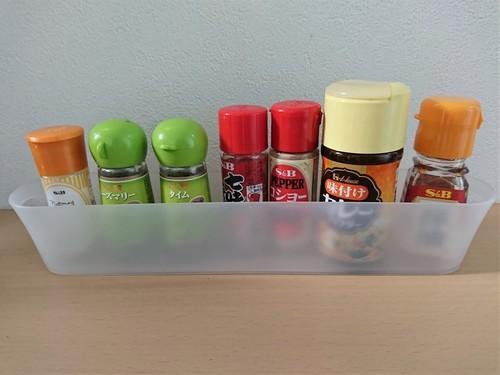 小瓶に入った調味料やスパイス類を並べて収納するのにもおすすめだ。セリアのミニドリンクストッカーに調味料を収納し、調理台に置いておくと使いやすい。また、普段は使わないスパイス類は、セリアのミニドリンクストッカーに入れてラックなどに収納しておくとよい。必要なときにはケースごと取り出せて便利だ。
