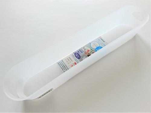 丈夫なプラスチック製で、前後に穴があいており、持ち手として使える。半透明なので、中身が確認しやすいのもポイントだ。耐熱温度は120℃、耐冷温度は-20℃なので、家庭用の冷凍庫でも使用可能である。
