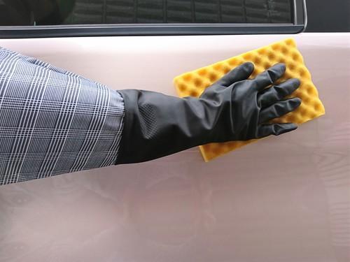 洗車の際にも、セリアのロンググローブを使うと便利だ。腕にかかる水を気にすることなく車を洗え、手荒れを気にすることもない。
