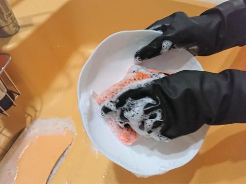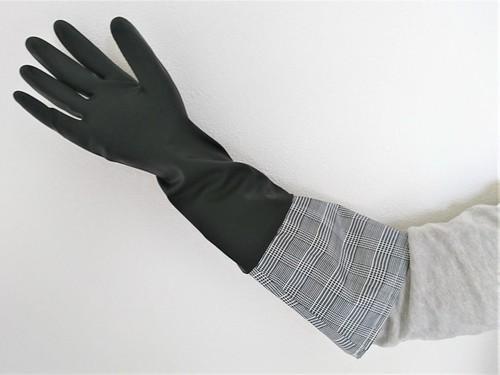 ゴム手袋をしない場合や、短いゴム手袋の場合は、飛び散る水で服のそでが汚れてしまう。汚れるのを防ぐためにそでをまくっても、すぐにずり落ち、そのたびにそでをまくる作業が必要となって、かなり面倒である。せっかくゴム手袋をしていても、短いゴム手袋では中に水が入りやすく、手が荒れてしまうこともあるだろう。