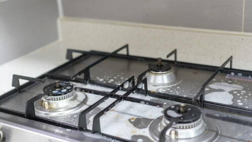 レンジフードやフィルター、ガスコンロや五徳、便器の内側の縁、浴室のカビなどの頑固な汚れは、あらかじめ洗剤をつけて放置しておく。時間の経過とともに汚れが浮き上がって掃除しやすくなり、放置している間に別の場所を掃除できて時短にも繋がる。汚れがひどい場合は、洗剤をなじませた後にラップをして浸透させておこう。