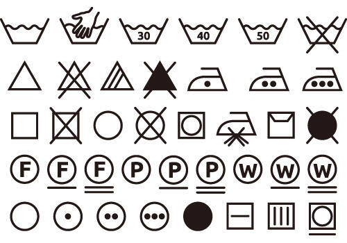 「家庭洗濯」「漂白」「乾燥」「アイロン仕上げ」「商業クリーニング」の基本記号があり、そこに「強さ」「温度」「禁止」といった付加記号や数字が付く。記号で表現できない場合は、記号の近くに日本語で表記されている。