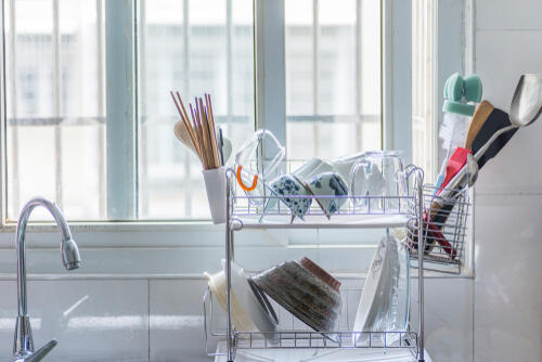 シンクに設置する水切りラックは、洗ったお皿や箸、コップなどをそのまま立てかけるなどして、水切りから自然乾燥まで任せられる便利なアイテムだ。布巾で拭く必要がないため、家事の時短にも繋がるし、布巾のイヤなニオイが移ってしまうこともない。