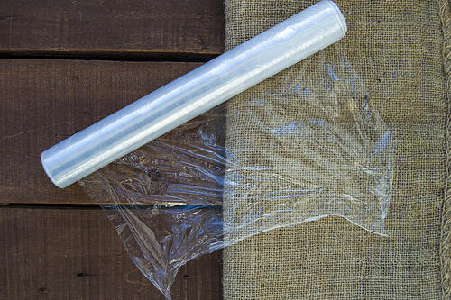 カビキラーの上からラップをかぶせてパックする。ラップをかぶせることで泡の密着を高めたり、水分の蒸発を防ぐ効果が期待できる。隙間のないようにラップの上から軽くおさえるとよい。