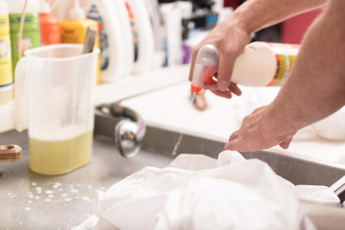 白地のコットンやポリエステルなどに付着したしみは「塩素系漂白剤」、同じ白地でもシルクやナイロンなら「還元系漂白剤」、色柄物のしみは「酸素系漂白剤」といったように、素材による漂白剤の使い分けも大切になる。商品の説明書きをよく確認しておこう。