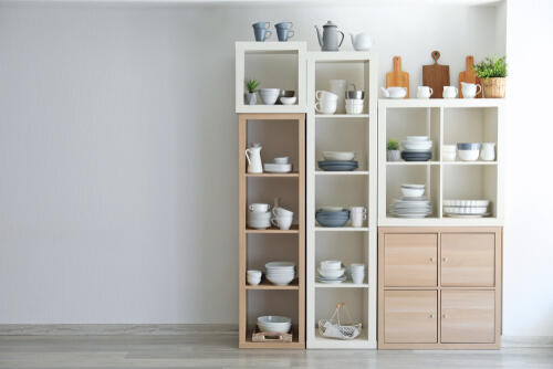 使用頻度が高い食器とそうでない食器を分け、よく使うものだけをキッチンに収納する。ラックや小さな棚を使いやすい場所に配置して、簡易的な食器棚として使ってもよいだろう。