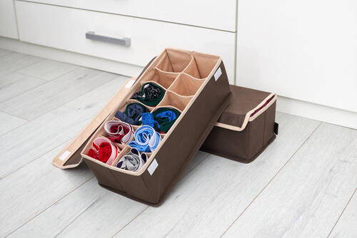さらに、仕切りのついた収納ボックスを使うのもいい方法といえる。パンツ1枚がちょうど収まるくらいの仕切りがついたボックスだと、1枚ずつ立てて収納できる。上で紹介したような、パンツのゴム部分に裾を差し込むたたみ方でしまうと、見た目も非常にスッキリとするはずだ。