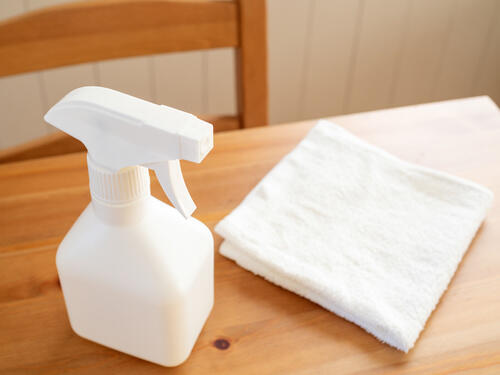 水を使える場所の掃除には、より殺菌効果が高い消毒用エタノールを使おう。無水エタノールと水を8対2の割合で混ぜ、スプレーボトルに入れたら完成だ。
