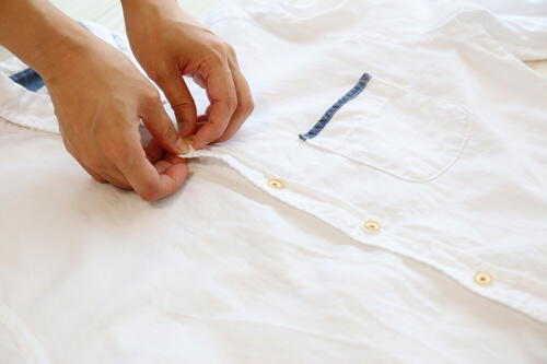 まず手始めに、ワイシャツのすべてのボタンを留めること。こうすることでワイシャツをたたむときに生地がずれないため、きれいに収納できる。面倒だという場合は、ワイシャツの第一、第三ボタンは最低でも留めるようにしよう。ボタンを留めたらワイシャツを裏返そう。