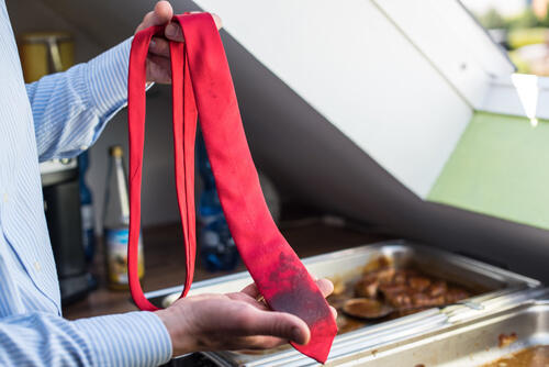 ポリエステルなどが多く使用されていて水洗い可能なネクタイは、自宅で染み抜きしても問題ない。ここでは、ネクタイにつきやすい食事の油染みを取る方法を解説しよう。