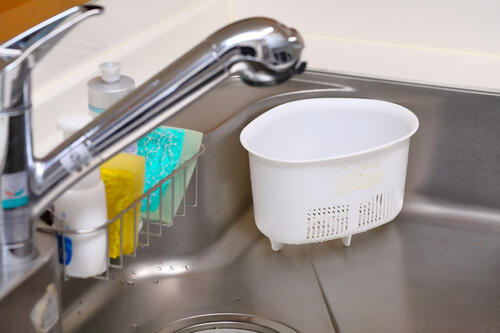 シンクに取り付ける水切りかごにスポンジを置く、といった収納方法もある。洗い物をした直後で濡れたままの食器があるときは難しいかもしれないが、何もなければ少し斜めに立てて水キレをよくしておこう。改めてラックやホルダーを購入するコストも省ける。