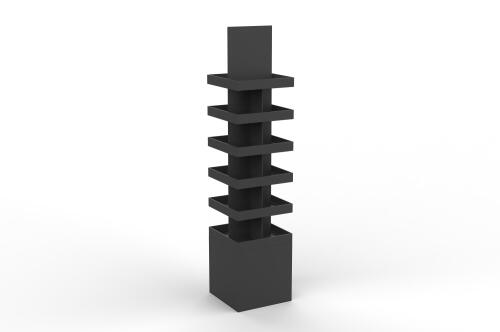 一方のブックタワーは、底面と柱状の裏板、複数の棚板から構成されている。本を収納するときは、地面に平行になるように棚板に寝かせて置く。