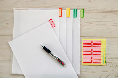 仕切り付きのファイルに書類を分類したら、ラベリングをするだけでかなり見やすくカスタマイズできる。書類の分類項目に決まったルールはない。それぞれわかりやすい分類項目をラベルのカラーや文字で表示しておけば、オリジナル書類ケースを作ることができる。
