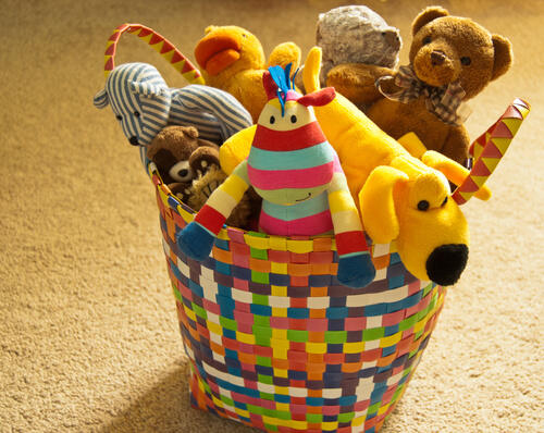 たくさんある子どものぬいぐるみは大きなかごに入れて一箇所にまとめる。入れるだけで収納できるので、子どもでも片付けがしやすい。フタがついていないタイプなら、小さな子どもでも出し入れが簡単だ。