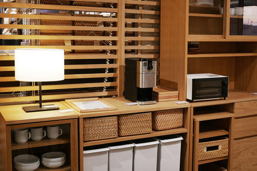 調理家電や見せたい食器類以外は、外から見えないようにカゴやボックスに入れてキッチンラックに収納するのがおすすめだ。こまごまとした弁当グッズや、出ているだけで散らかっている印象を与えてしまうゴミ袋などは、種類ごとにまとめてボックスに入れるとよい。