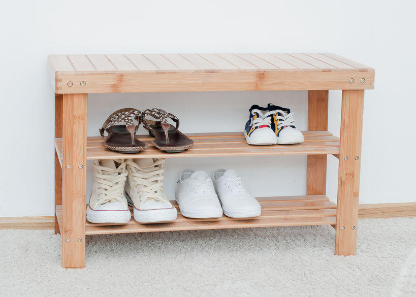 玄関に置くなら、小さめのタイプもある。玄関に置ききれない靴や靴磨きアイテムなどの収納もでき、靴を脱ぎ履きするときはベンチに座れるので便利だ。
