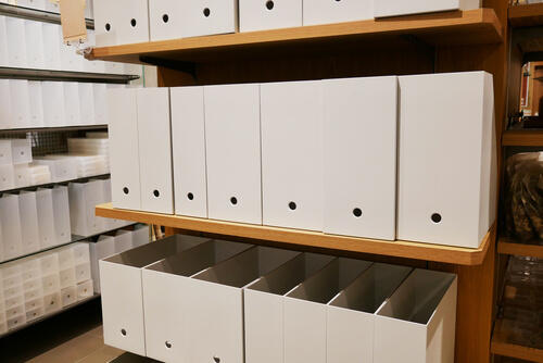 とくに、ファイルボックスのように縦長の収納ボックスは、収納しにくいガムテープを立てて収納できる。ガムテープと一緒に荷造りに使う紐やハサミを収納すると便利だろう。