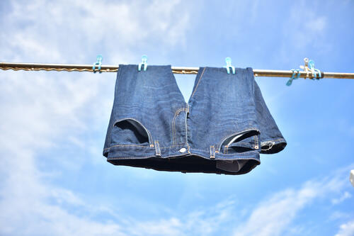 早く乾かすには天日干ししたくなるが、デニムは直射日光に弱い。直射日光に当たると変色のリスクもあるため、陰干しするのが鉄則だ。また、デニム生地は厚くほかの衣類に比べて乾きにくいため、風通しのいい場所でしっかり乾かそう。生乾きのまま取り込むのはNGだ。