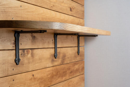 壁に付けられたベッド横の収納は、壁を上手に使うといい。ホームセンターなどで手軽にDIYアイテムを手に入れられる。
