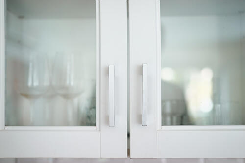 カップボードの上段にワイングラスなどの割れやすい物を収納するなら、つっぱり棒でストッパーをするとよいだろう。見た目にも安心感があり、不慮の事故も防げるプチアイデアだ。