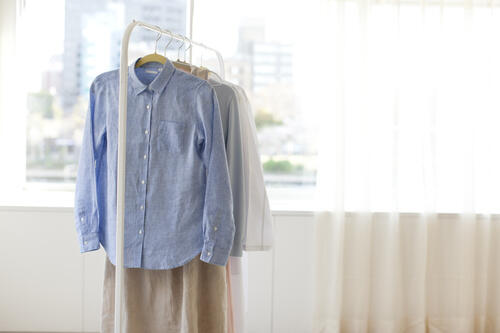 いろいろな洋服をかけると、まとまりのない印象になる。ハンガーラックに部屋のインテリアと合ったおしゃれな布やカバーをかぶせれば、キレイに隠すことが可能だ。ホコリ対策としても活用でき、着用するときだけ外せば洋服が汚れにくい。