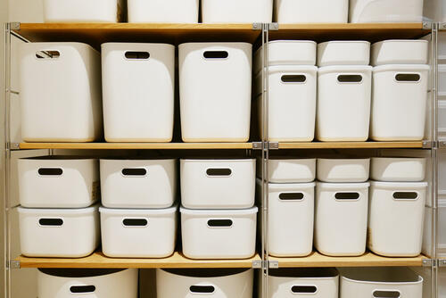 小さなハンドブレンダーには収納ボックスがおすすめだ。100均でも購入でき、複数用意してラベルを貼ればパーツの分類ができる。統一感がでるように、同じ色とサイズの収納ボックスを棚に並べるのがポイントだ。取っ手付きタイプを選べば出し入れもしやすい。