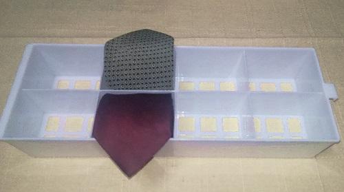 仕切りがついているダイソーの「ランジェリー収納BOX」は本来靴下や下着を収納する100均商品だが、アイデア次第でネクタイを丸めて収納するのにおすすめだ。引き出しに入れるのに適した幅と深さ、仕切りの大きさは丸めたネクタイ1個分が入る大きさで、ネクタイ同士がこすれて毛羽立ったり、圧着して型崩れが起きたりするのを防いでくれる。