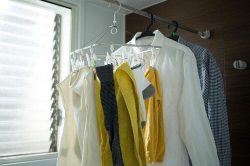 また、たとえばランドリーバーがあり、中央付近の天井に吹出口があるとしよう。その場合、厚手のものはできる限りバーの中央、つまり吹出口の近くに掛け、外側へ向かうに連れて薄手のものとなるように干し方を工夫しよう。洗濯物同士がくっついていると乾きにくいため、ある程度間隔をあけて干すことも大切だ。