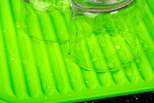 吸水マットと同じ要領で使えるのが、100均の「シリコンシート」だ。シリコンシートは柔らかく、滑りにくいのがメリットだ。使いたい場所へ好きな形で置けるので、便利に使うことができる。シリコンシートには適度に溝が施されているので、食器から落ちる水もしっかりと水切りができる。収納する際は、壁にぶら下げたり、丸めたりすることができるので、キッチンがせまく、省スペースで使いたい方にぴったりだ。