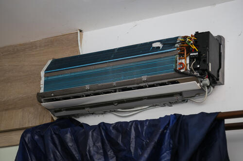 部屋が汚れないように養生してから行う。まず、エアコンカバーやフィルターを外す。掃除機を使ってフィンの周りのホコリを取り除く。