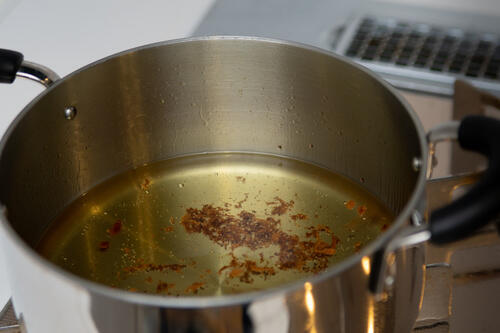 市販の油固め剤がないときは、片栗粉で固めることができる。油が冷めないうちに(熱いうちに)、油と同量の片栗粉を混ぜるのがポイントだ。市販の油固め剤ほどではないが、可燃ごみとして捨てられるくらいには固められるだろう。