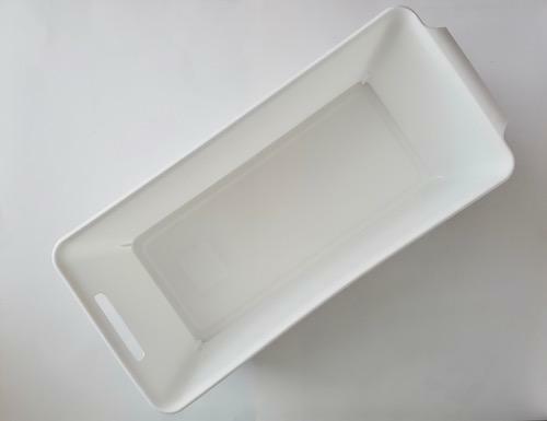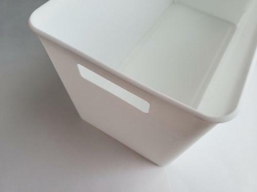 これにより、好きなほうを手前にすることができ、収納の空間の形状に合わせて並べることができる。またカゴのなかに隙間なくたくさんのものを入れている場合は、穴に指を入れづらいため、フック状の持ち手を手前側に設置するととても使いやすかった。