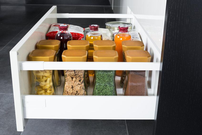 見やすく出し入れしやすいのが引き出し収納のメリットだ。深いタイプの引き出しなら、大容量の調味料のストックに向いている。調味料の種類ごとに分類して収納すればわかりやすい。一方で倒れやすいといったデメリットもあるので、収納には工夫が必要だ。