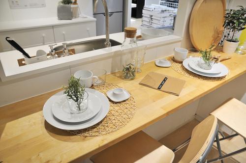 カウンターをテーブル代わりに使うと、オシャレな食事スペースになる。スツールやチェアを置いて、カフェやバーのようなイメージで使ってみてはいかがだろう。