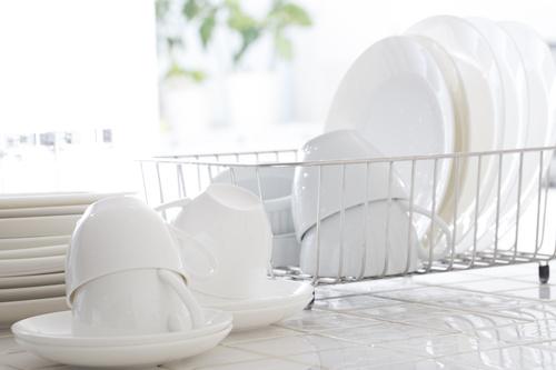 狭いキッチンで大きなスペースを取るのが水切りカゴだ。洗った食器がカゴに山積みになっているだけでも、キッチンをゴチャゴチャに見せてしまう。そこで水切りカゴは使わず、折りたたみの水切りラックを使ってみよう。