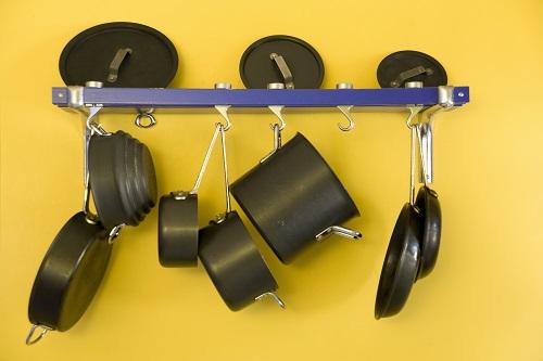 狭いキッチンでは「吊るす」ことで収納スペースが確保できる。マグネット、S字フックなどさまざまなアイテムを駆使して収納場所を作り出そう。
