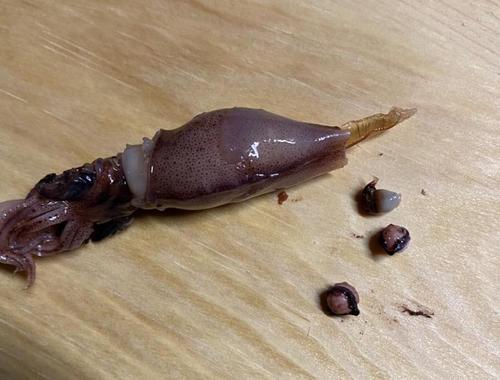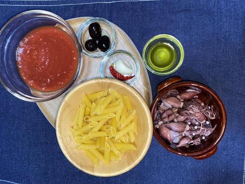 ホタルイカの下処理をする。目、口を指でつまんで取る。 上のほうを軽くつまんでひっぱると、軟甲も一緒にするりと抜ける。 ニンニクは包丁を上から押し当ててつぶし、ブラックオリーブはスライスしておく。